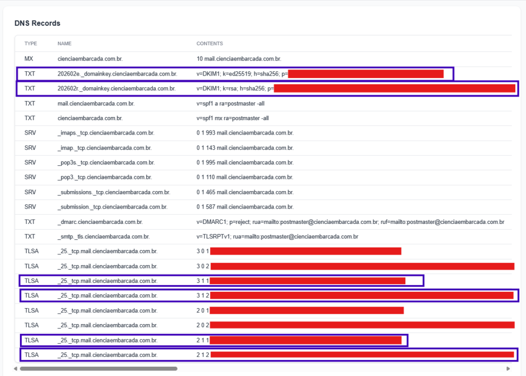 Agora você vai ver todos os registros DNS que você precisa configurar, mas se você seguiu todos os passos anteriores, só faltaram alguns, e os principais deles são os que eu demarquei em roxo na imagem abaixo: