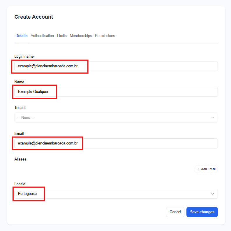 Agora você pode configurar um e-mail, idioma para um usuário, mas é muito importante que o Login name seja igual ao Email.