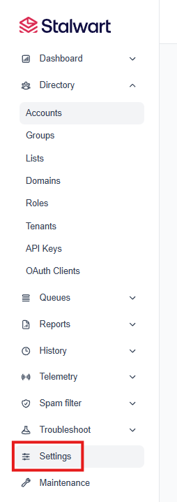 Faça o login utilizando o usuário “admin” e senha que apareceu no terminal quando você fez o primeiro deploy. Dentro do painel do Stalwart, acesse a página Directory -> Domains.