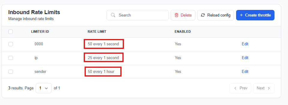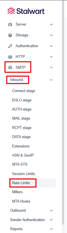 Na página de configurações, acesse a opção SMTP -> Inbound -> Rate Limits.