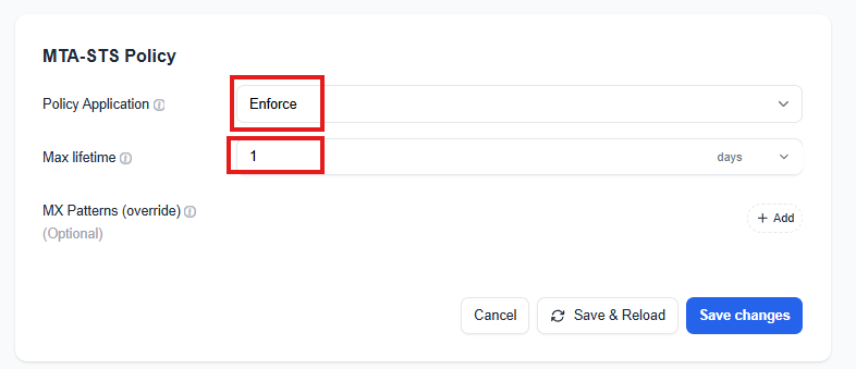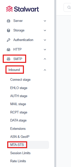 Agora você só precisa ajustar as políticas de MTA-STS em SMTP -> Inbound -> MTA-STS.