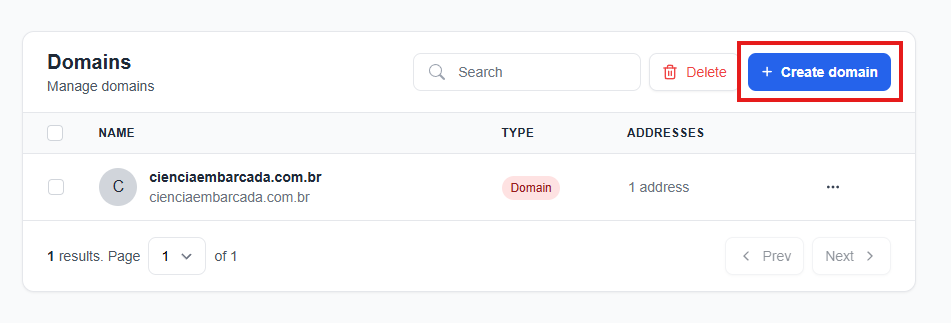 Dentro dessa página, clique no botão de criar um novo domínio.