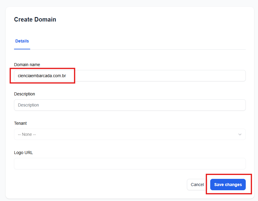 Depois é só preencher como o nome do seu domínio (no meu caso é “cienciaembarcada.com.br”) e salvar.